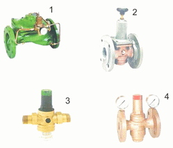Druckminderer mit einstellbarem Hinterdruck oder eigenmediumgesteuert (1), mit Flanschanschluß (2) oder Innengewinde (3), mit oder ohne Manometer, aus Messing, Rotguß (4), Grauguß, Chrom-Nickel-Stahl, oder Stahlguß, für verschiedene Medien und Anwendungen