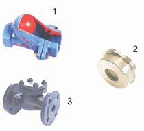 Durchgangs- oder Eckform, Schrägsitzausführung, Kugelrückschlagventil (1), Zwischenflansch-Ausführung (2), mit Auskleidungen (Gummi oder Teflon), Gewinde- oder Flanschanschlüsse (3)